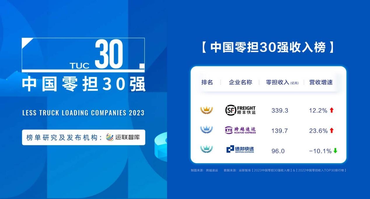 但,過去的16年時間里,就在大家認為快遞領(lǐng)域的競爭進入白熱化階段的時候,跨越卻加速崛起“后來居上”。8月9日,運聯(lián)智庫頒布2023中國零擔排行榜,跨越以139.7億總營收蟬聯(lián)榜單第二名(第一是順豐,第三是德邦),營收增速逆勢提升到23.6%,領(lǐng)跑榜單三甲企業(yè)(順豐12.2%,德邦-10.1%)。